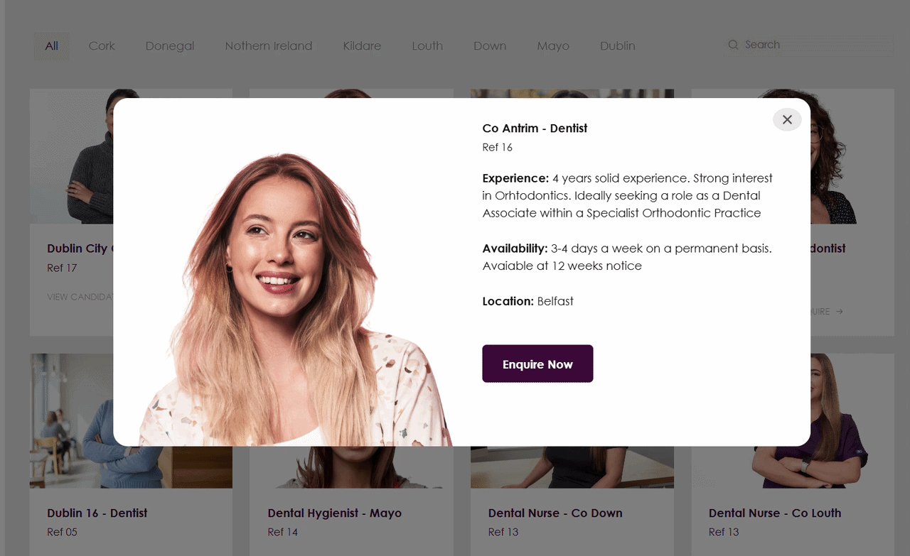 Whether you're seeking a Consultant, Specialist, Dentist, Dental Hygienist, Dental Nurse or any other discipline in dental nationwide, our Candidate Catalogue gives you direct access to profiles that match your clinic’s needs.